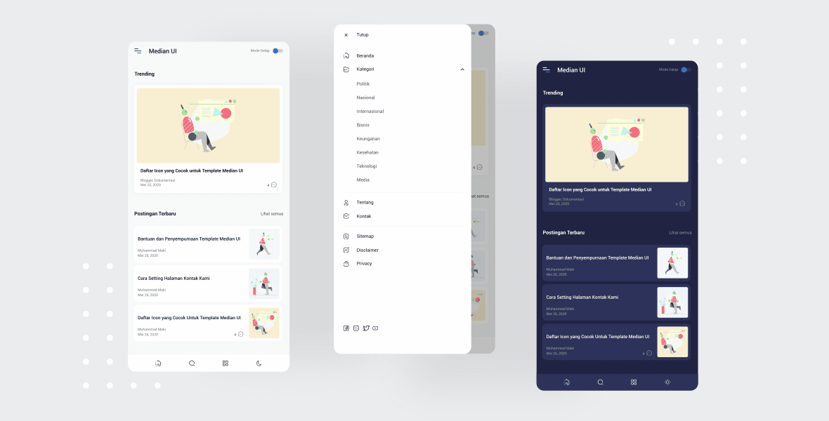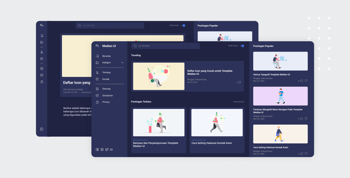 Trong template này, tác giả đã thử nghiệm áp dụng một yếu tố bảng điều khiển trên blog cuối cùng đã sinh ra Median UI, mẫu này được khuyến nghị hơn cho các blog có chủ đề tin tức hoặc chủ đề hỗn hợp nhưng điều đó không có nghĩa là nó không phù hợp với các chủ đề khác.Tác giả lấy cảm hứng này từ sự xuất hiện của một số trang web nổi tiếng như Google Adsense và Google Drive cũng như từ một số yếu tố UI mà chúng tôi tìm thấy trên Dribbble. Được hỗ trợ với các biểu tượng đơn giản và hài hòa, làm cho mẫu này có cảm giác như giao diện của một ứng dụng cung cấp trải nghiệm đọc bài viết thoải mái hơn và không nhàm chán.