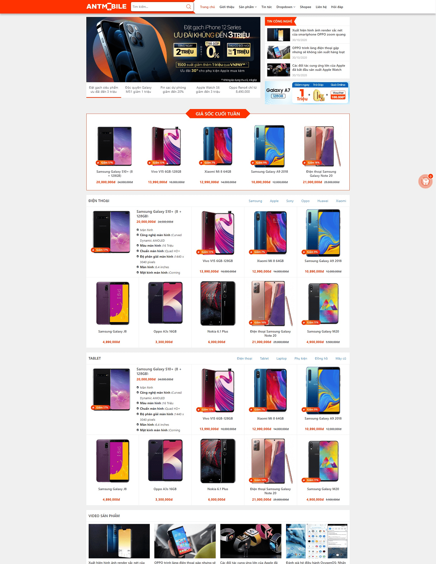 Giao diện website Ant Mobile được thiết kế cho cửa hàng kinh doanh điện thoại, siêu thị mini, hàng công nghệ. Thích hợp cho cửa hàng bán đồ công nghệ online.